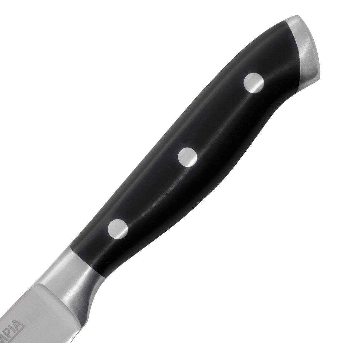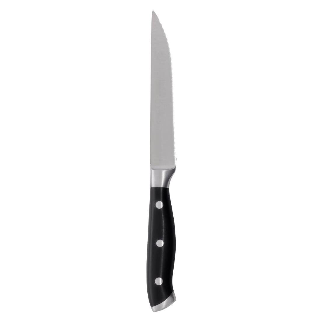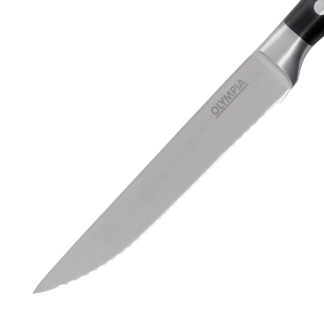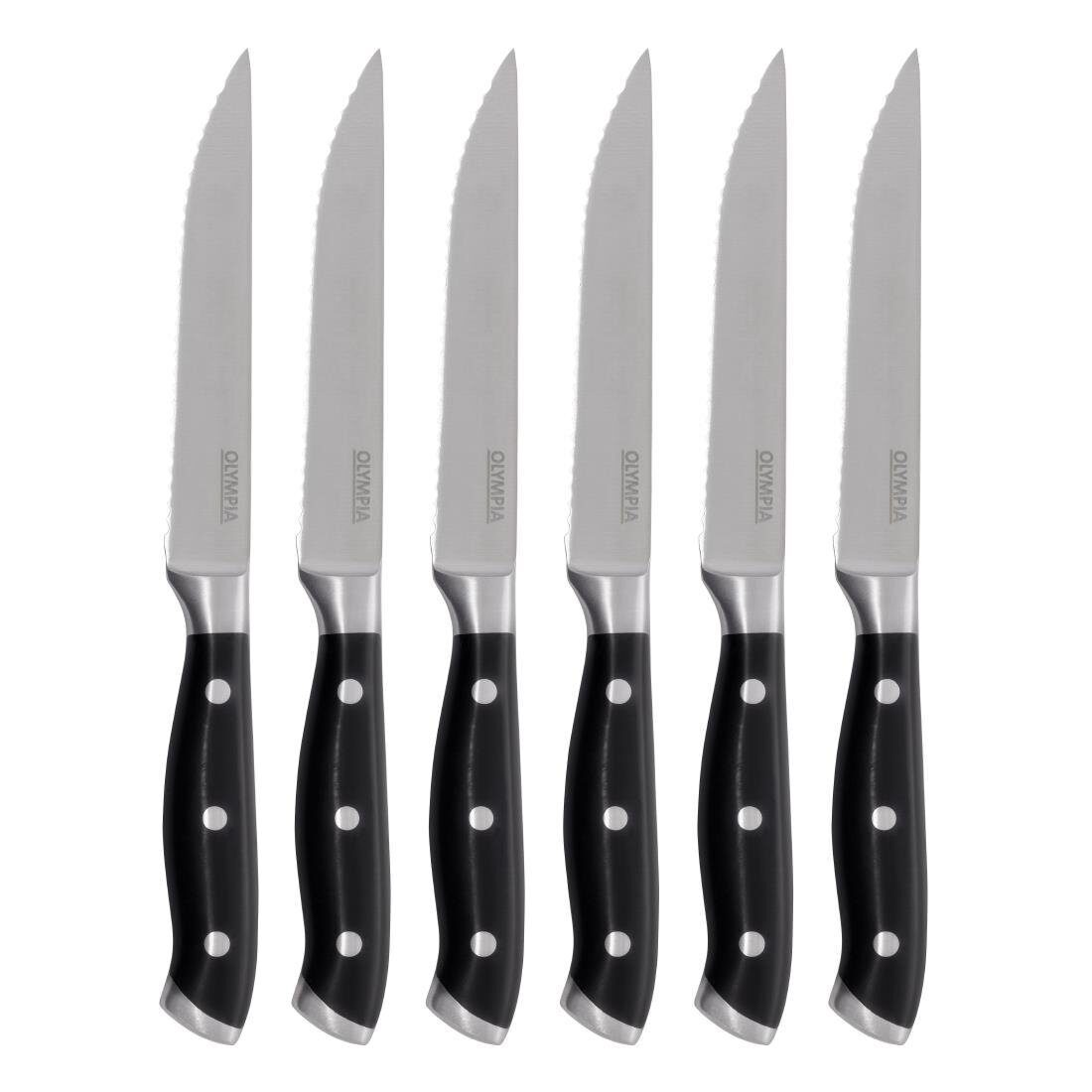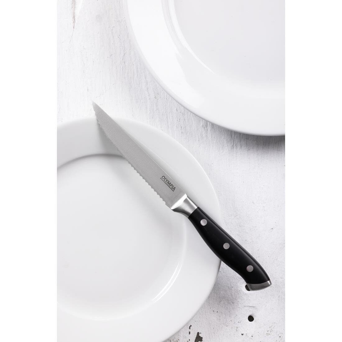 De premium roestvrijstalen steakmessen van Olympia hebben een fijn gekarteld lemmet dat moeiteloos door vlees snijdt, voor een soepele en precieze snijervaring. Het zwarte ABS handvat met volledige angel is ergonomisch ontworpen voor comfort en is beveiligd met stevige klinknagels voor verbeterde duurzaamheid en stabiliteit. Deze messen zijn niet alleen functioneel maar ook stijlvol, waardoor ze een perfecte aanvulling zijn op elke eettafel. Handig genoeg zijn ze vaatwasserbestendig, wat zorgt voor gemakkelijke en probleemloze reiniging na elk gebruik.