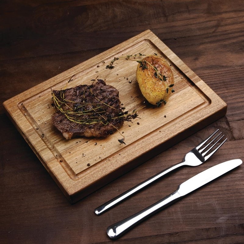 Kleine, acaciahouten steakplank van Olympia met geul om alle vleessappen op te vangen. Ideaal om op eigentijdse wijze steaks en burgers te serveren.