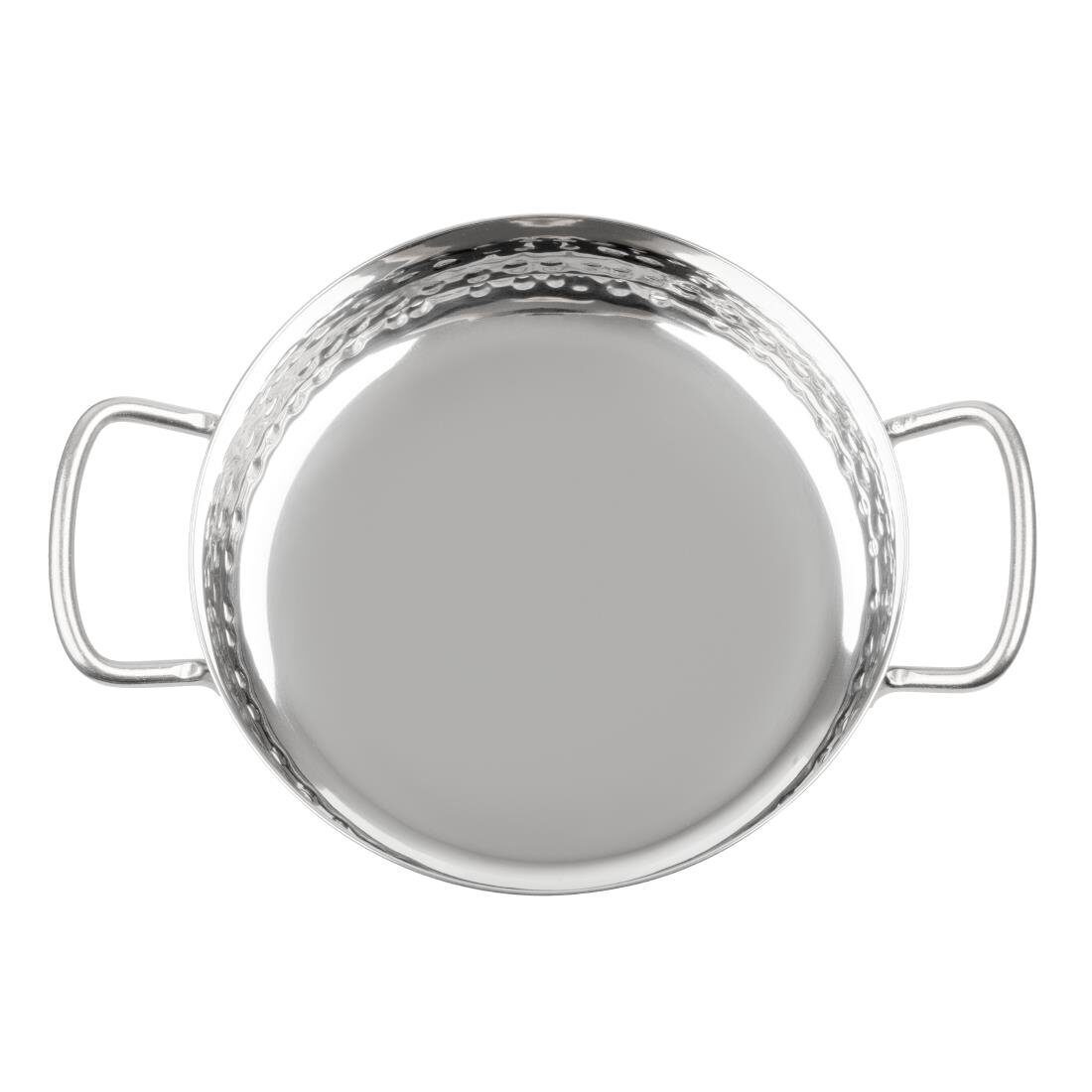 Gehamerd roestvrij staal, lichtgewicht servies met opstaande rand. Vaatwasmachinebestendig.