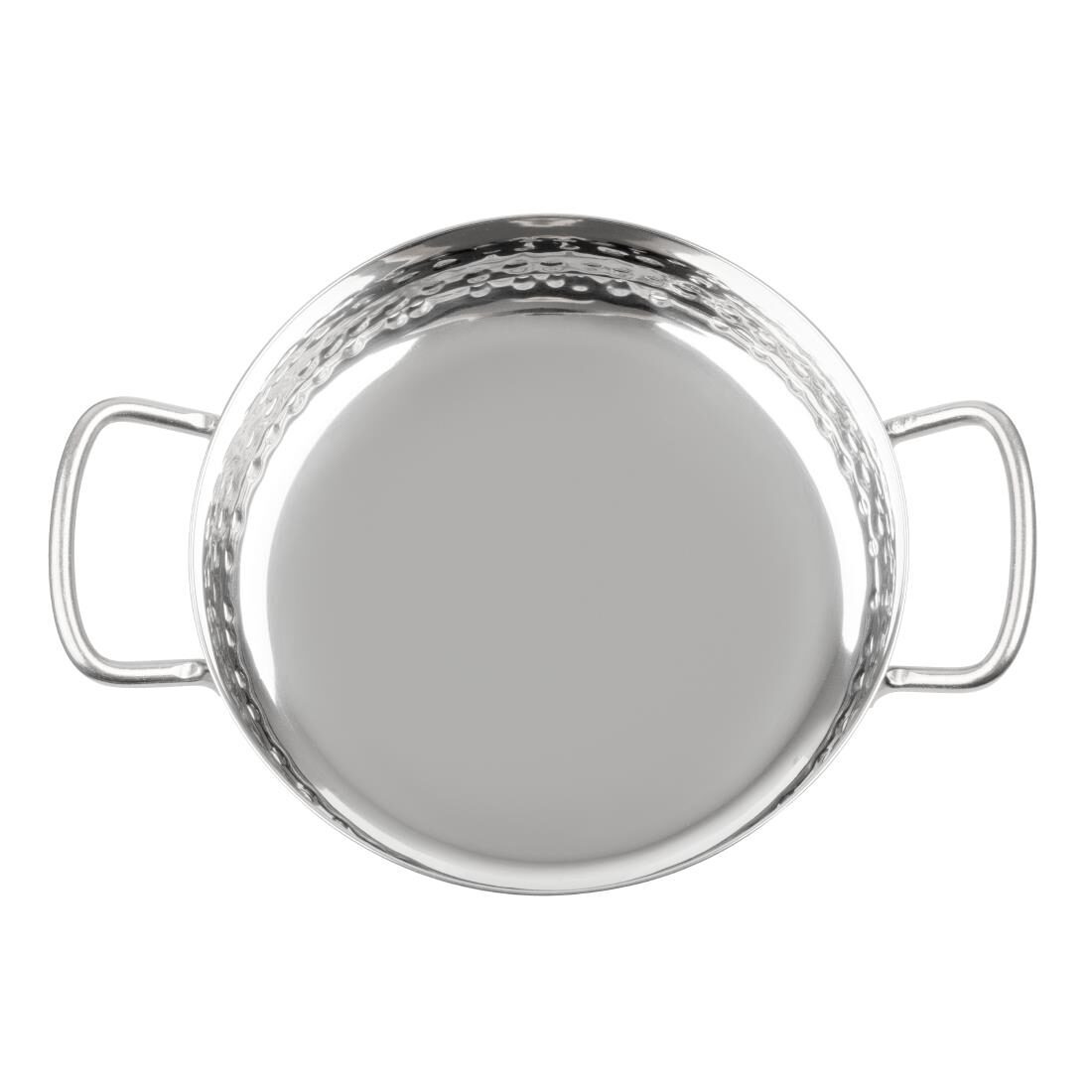 Gehamerd roestvrij staal, lichtgewicht servies met opstaande rand. Vaatwasmachinebestendig.