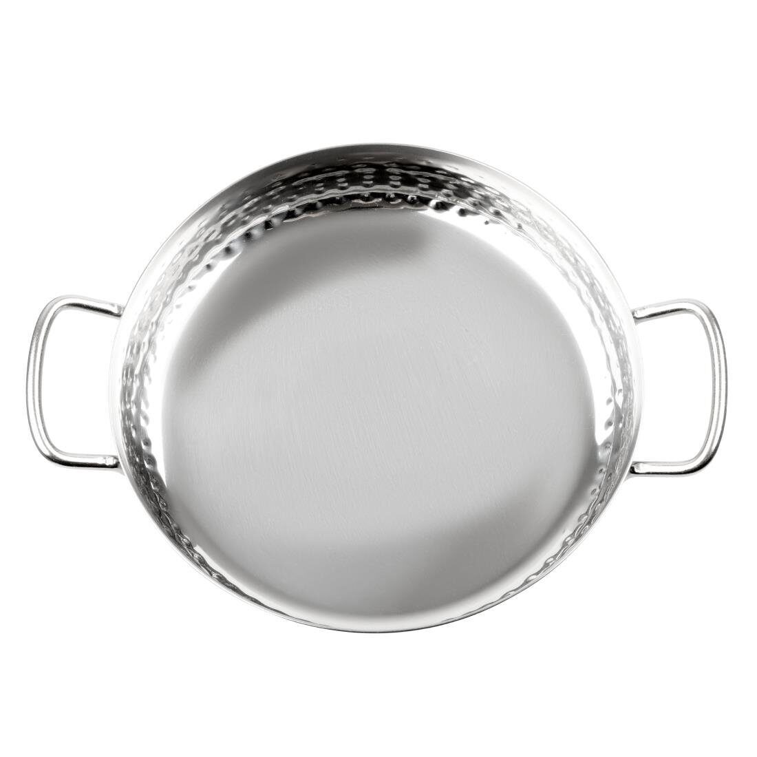 Gehamerd roestvrij staal, lichtgewicht servies met opstaande rand. Vaatwasmachinebestendig.