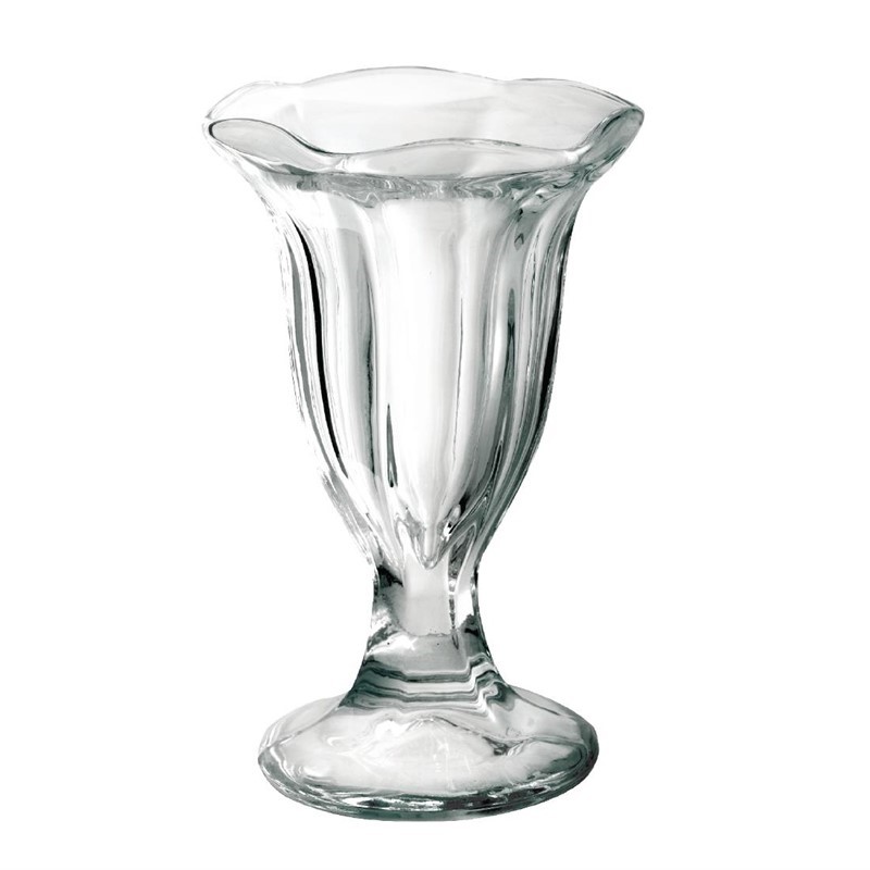 Traditionele en elegante glazen ijscoupes, gemaakt van duurzaam persglas.