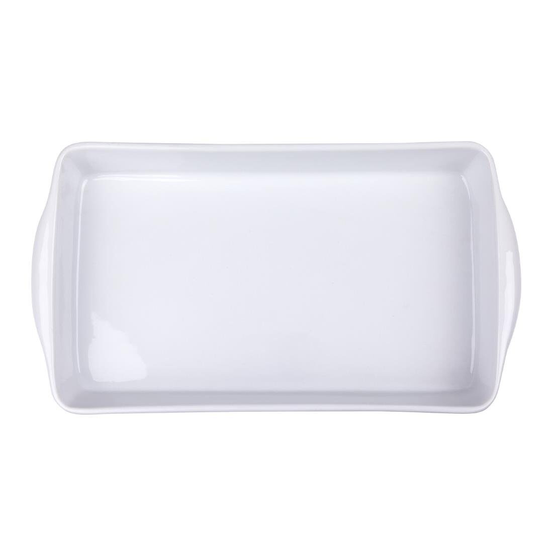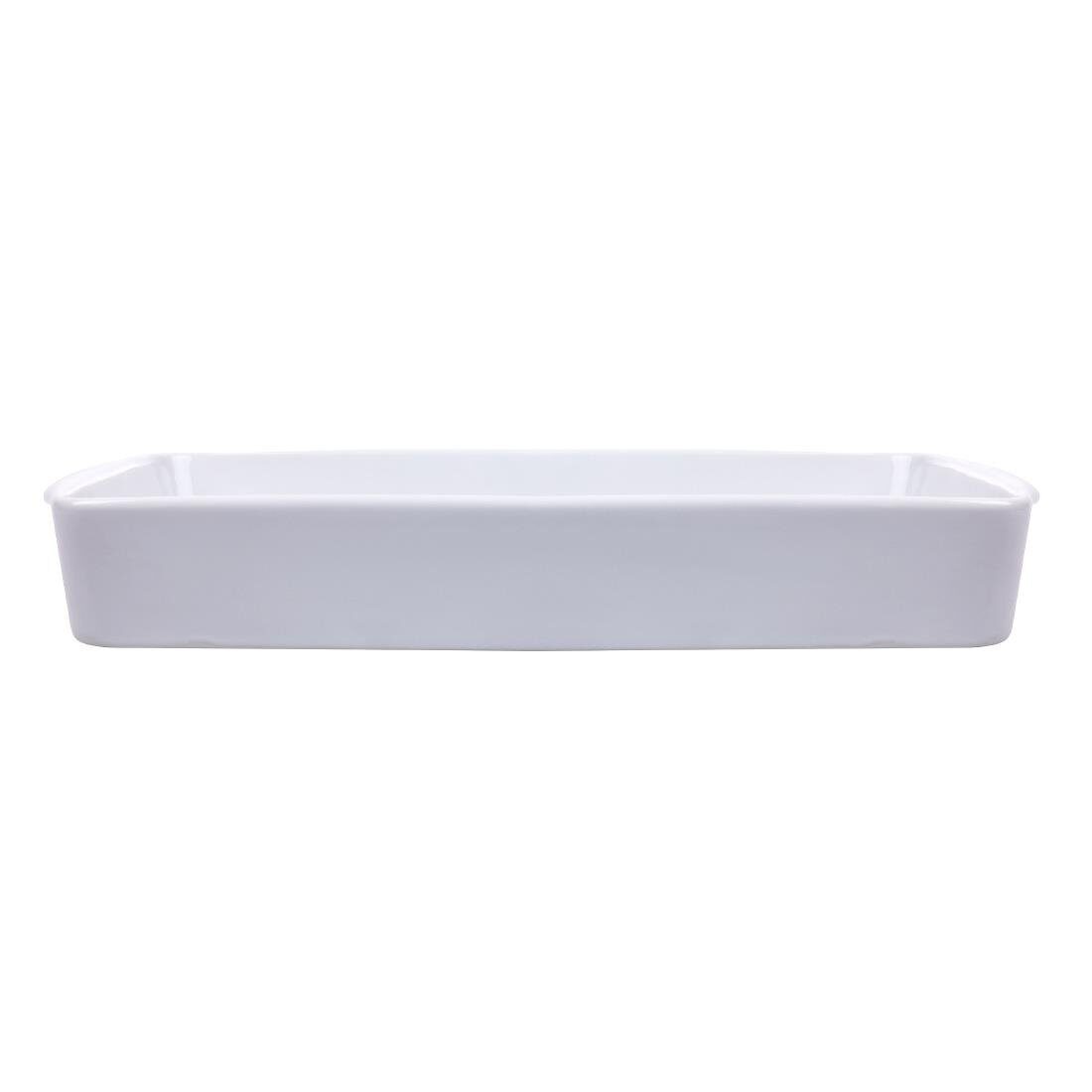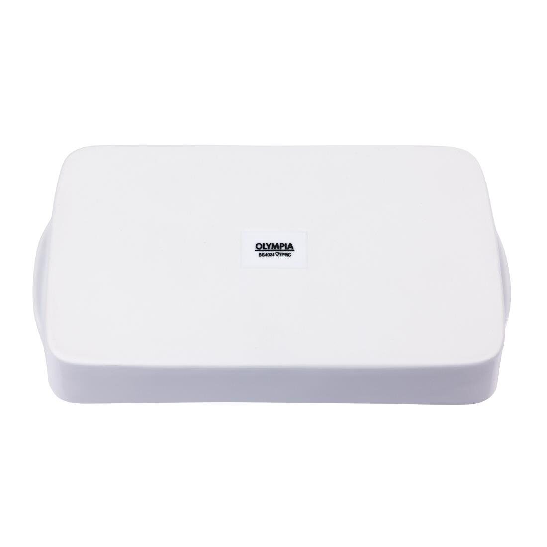 Een langwerpige ovenschaal van Olympia, ontworpen om een voordelige en slijtvaste oplossing voor puur wit porseleinen servies te bieden voor drukke hotels, kantines en restaurants.