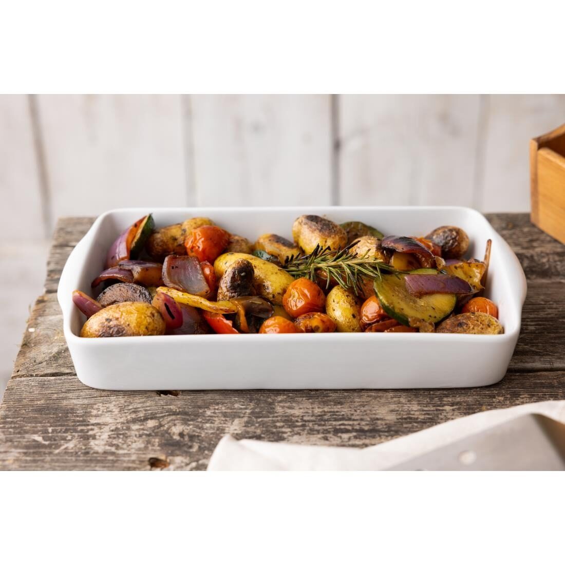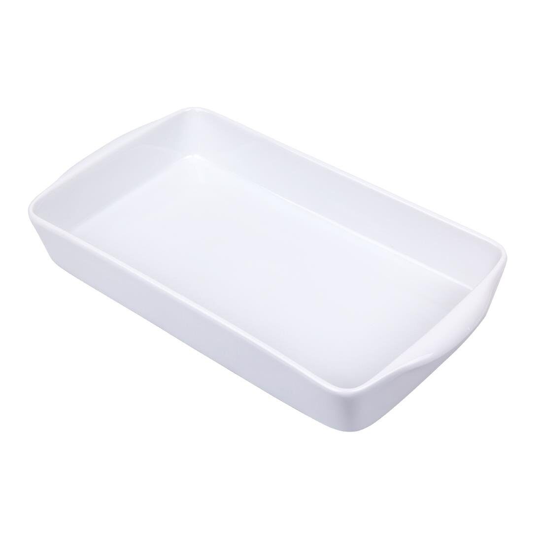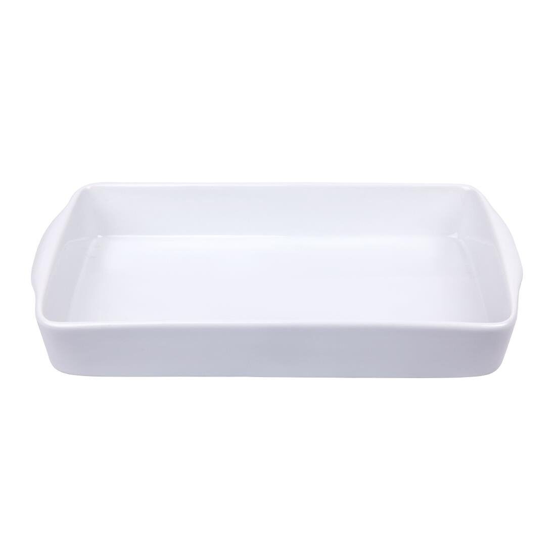 Een langwerpige ovenschaal van Olympia, ontworpen om een voordelige en slijtvaste oplossing voor puur wit porseleinen servies te bieden voor drukke hotels, kantines en restaurants.