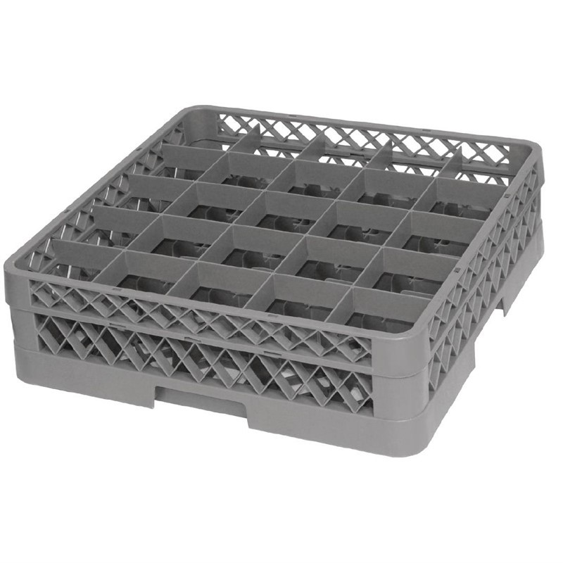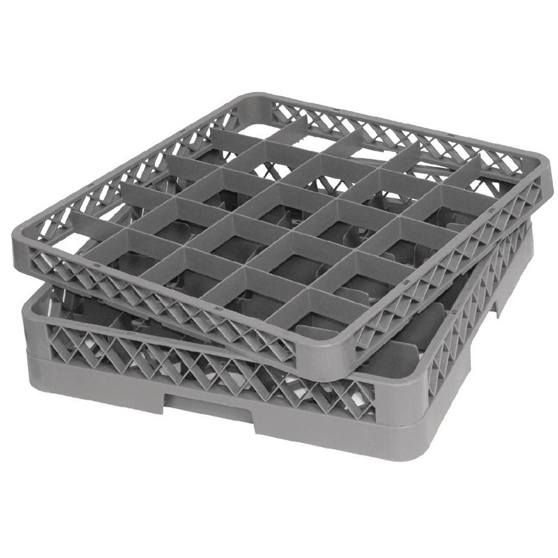 Deze grijze opzetrand van Vogue is vast te klikken op een glazenkorf (F613) en zorgt voor extra stabiliteit zodat ook hogere glazen of kopjes, zoals wijnglazen en champagneflûtes, afgewassen kunnen worden. Deze opzetrand met 25 compartimenten is geschikt voor de Vogue glazenkorf met 25 compartimenten (F613) en voor glazen met een diameter van 8,6cm of kleiner.