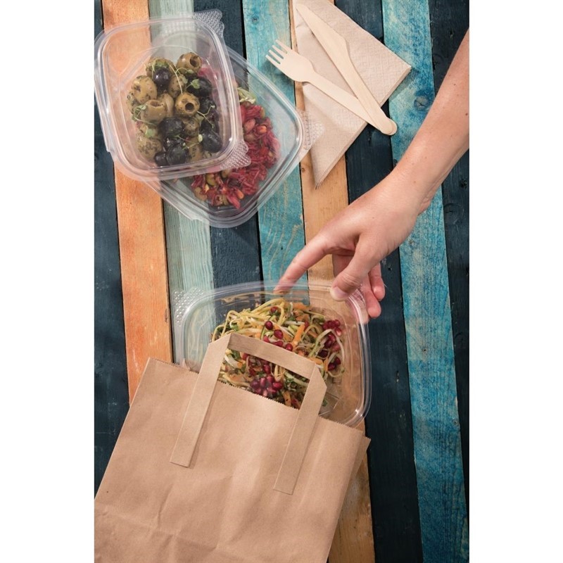 Bruine, papieren tassen zijn de basis van elke afhaalgelegenheid. Zo zijn ze ideaal voor eetkramen, afhaalrestaurants en groentezaken. Ze worden plat geleverd zodat ze weinig ruimte innemen en zijn in een paar seconden klaar voor gebruik. Ze zijn van goede kwaliteit en kunnen na gebruik worden gerecycled.