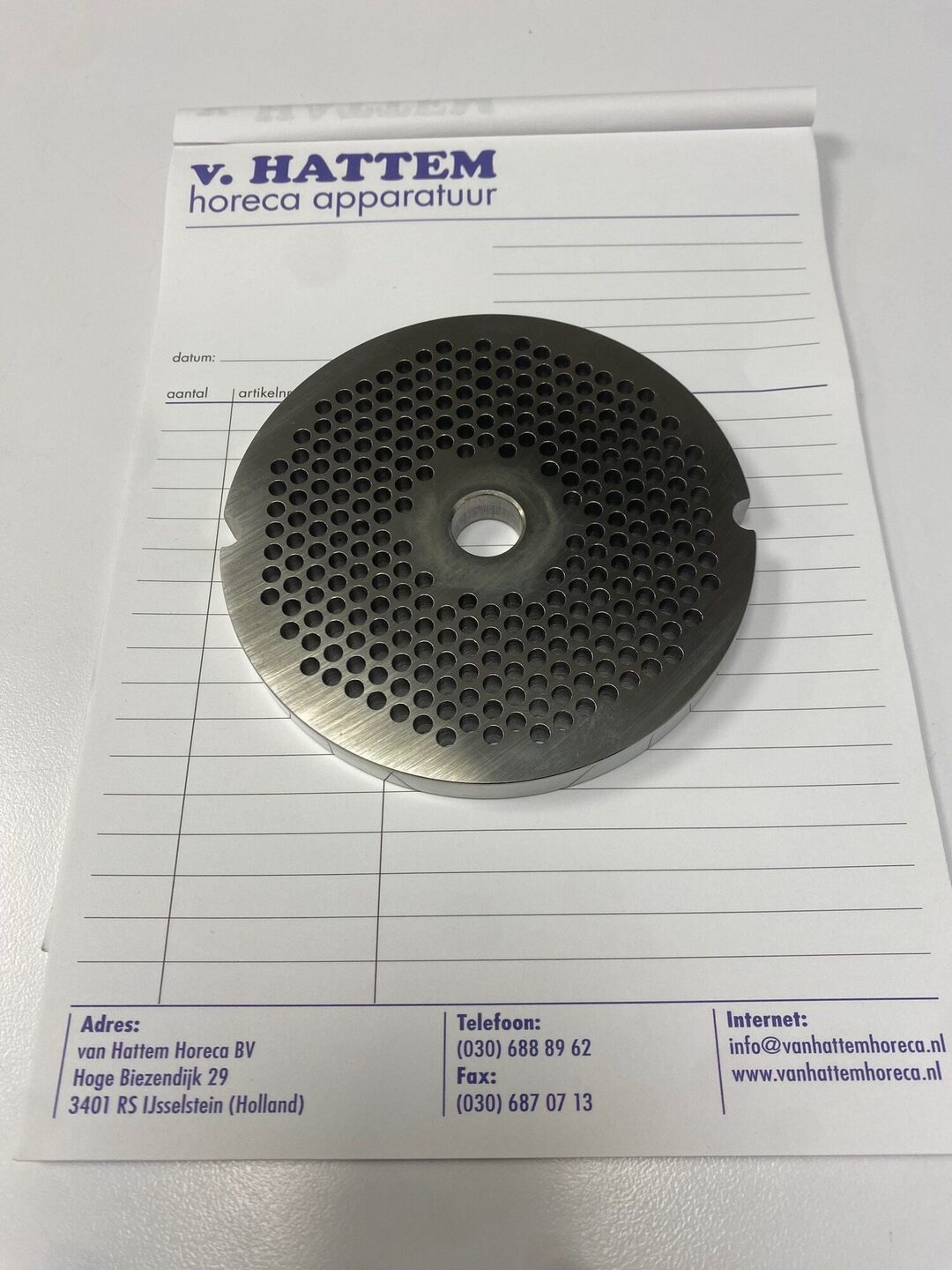 Betreft 1 plaat met 3,5 mm gaatjes tbv FAMA gehaktmolen type 32 (art. 410.132)