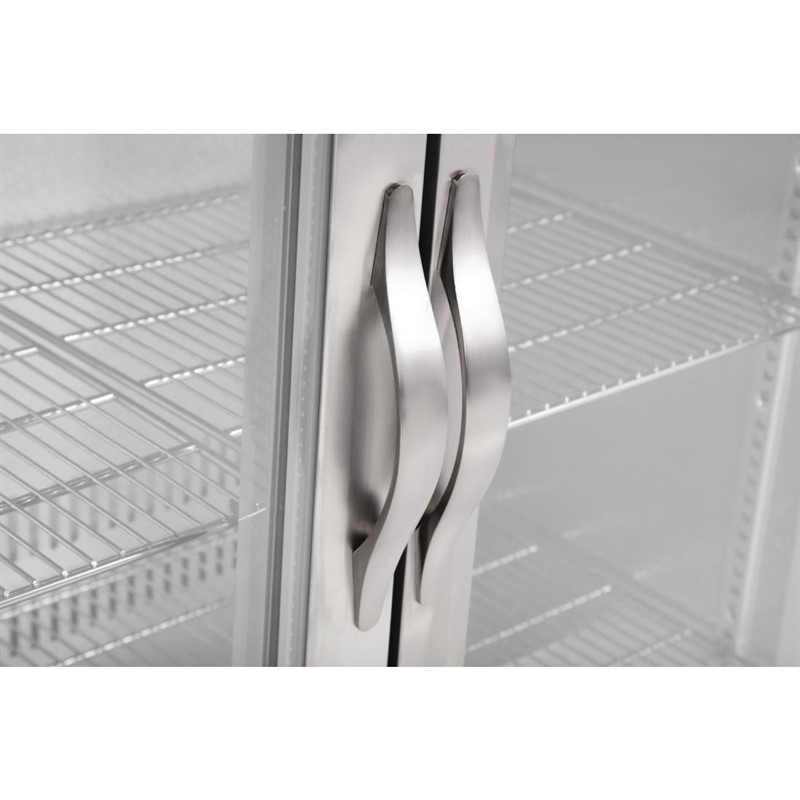 Het dubbel glas in de klapdeuren en de energiezuinige LED-verlichting houden de verbruikskosten laag, terwijl de intuïtieve digitale bedieining en de RVS constructie zorgen voor gebruiksgemak en eenvoudig onderhoud. De ruime capaciteit van 270 flesjes (330ml) is perfect voor bars, nachtclubs en meer.