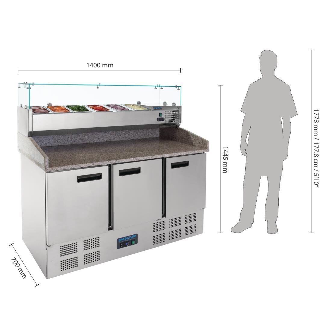 Gekoelde prepareer werkbank met marmeren werkblad en beschermde opbouw GN ruimte. Volledig automatische controller voorzien van digitaal display. Instelbare ontdooiing met tijdsinterval. Tijdige handmatige ontdooiing noodzakelijk. CFK vrij. GN bakken worden apart verkocht.