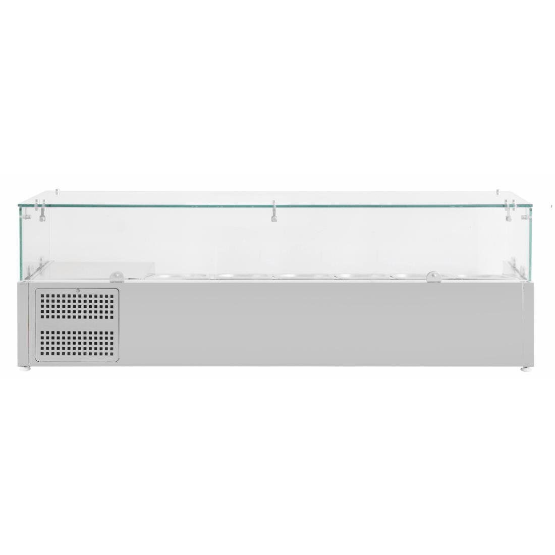 Innovatieve opzetkoelvitrine voorzien van glaswanden. Keuze uit behuizing voor GN 1/4 of GN 1/3 bakken tot 100mm diep.