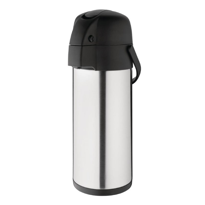 Pompkan van RVS. Dubbelwandig. Drukmechanisme. In twee maten verkrijgbaar.