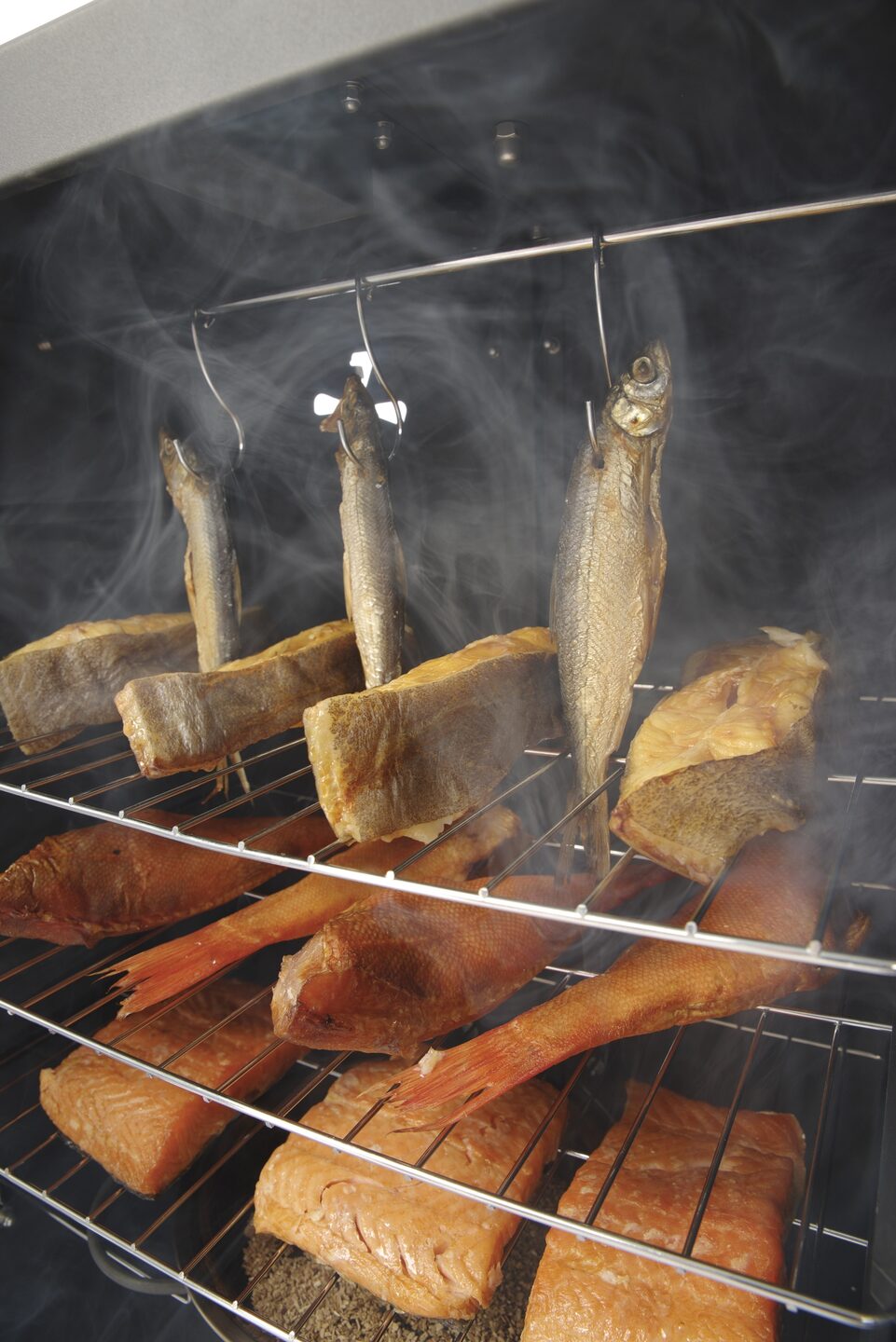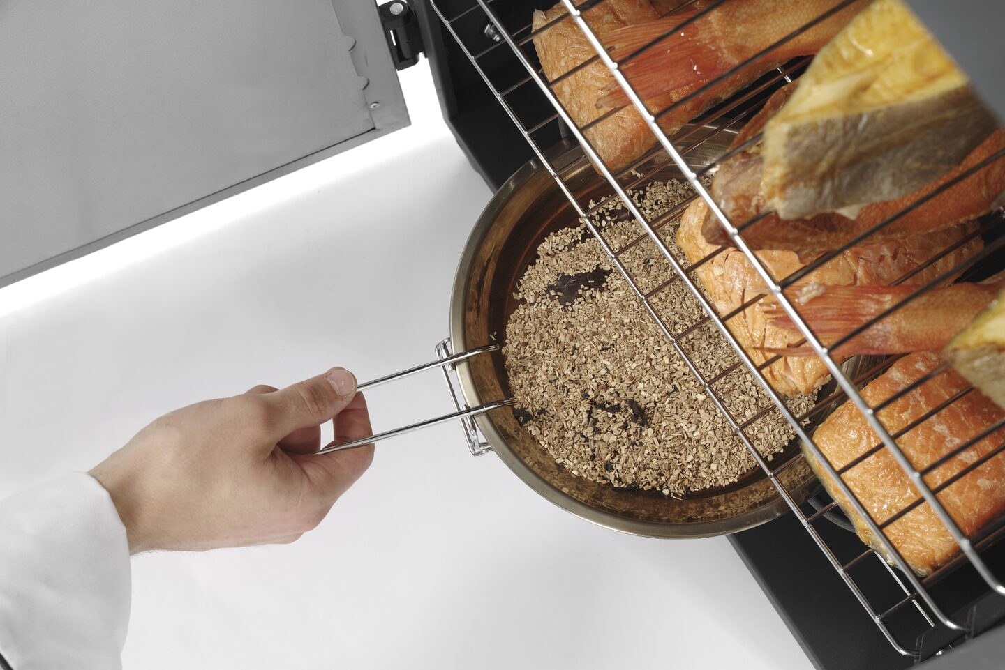 De rookoven is ideaal voor het roken en bereiden van vis, vlees, ham en groenten. Gemaakt van roestvast staal met magnetisch sluitende dubbel geïsoleerde deur. Temperatuur in te stellen via een thermostaat, geïntegreerde thermometer in de deur. Voorzien van een ventilatieopening aan de achterzijde. Wordt geleverd met 3 stuks 400x279mm roosters en beugel met 3 haken. Nieuw. Roestvast staal.