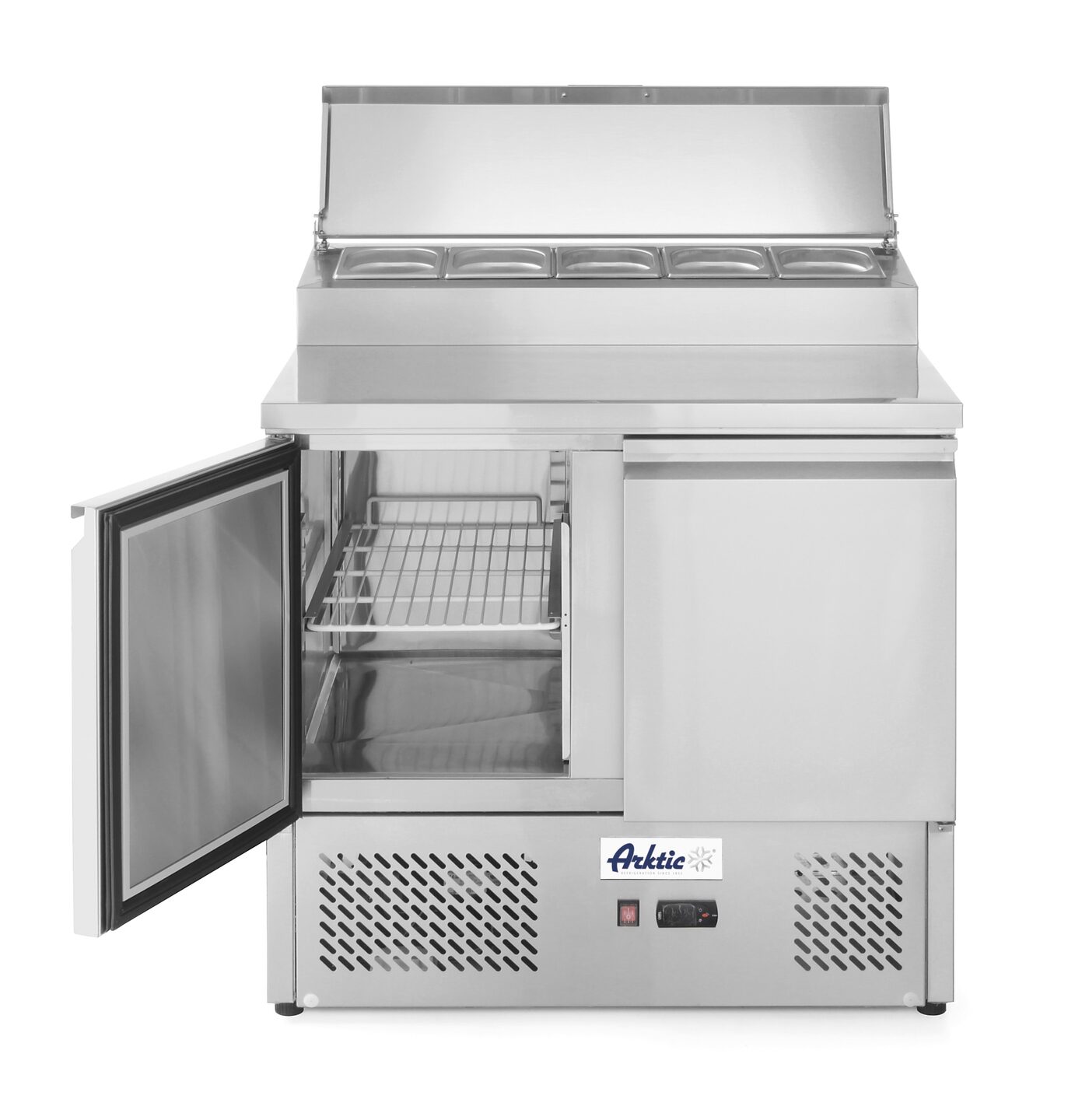 De binnen- en buitenzijde zijn gemaakt van hoogwaardig roestvast staal. Deuren voorzien van comfortabele handgrepen. Geforceerde luchtkoeling met automatische ontdooiing, compressor geplaatst onder de koelruimte. 35 mm dikke polyurethaanschuim isolatie. Met verstelbare rekken, geschikt voor GN bakken 1/1. Digitaal display en elektronische thermostaat. Met 4 verstelbare kunststof antislipvoetjes. Klimaatklasse: SN-T. Koelmiddel: R600a. Alle modellen worden geleverd zonder GN bakken. Met roestvast stalen deksel welke toegang biedt tot ruimte voor 5x GN 1/6 bakken met een maximale hoogte van 150 mm. Koelruimte afmetingen: 830x595x(H)500 mm. GN vitrine afmetingen: 900x265x(H)195 mm. Inclusief 2 schappen (335x570 mm). Maximum capaciteit 15 kg per stuk (bij gelijkmatige verdeling van het gewicht). Gewicht: 75 kg. Koelfunctie. Nieuw. Roestvast staal.