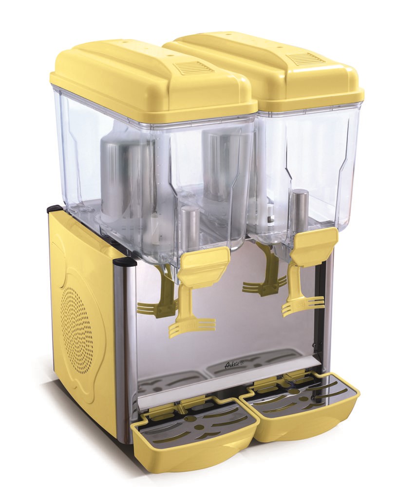Twee 12 liter-containers met snel doseerkraan. Met temperatuurregelaar, temperatuur kan worden ingesteld tussen 2°C en 8°C. Containers kunnen worden verwijderd om het schoonmaken te vergemakkelijken. Koelmiddel: R290. Lekbak inbegrepen. Nieuw. Polycarbonaat. Polypropyleen. Roestvast staal.