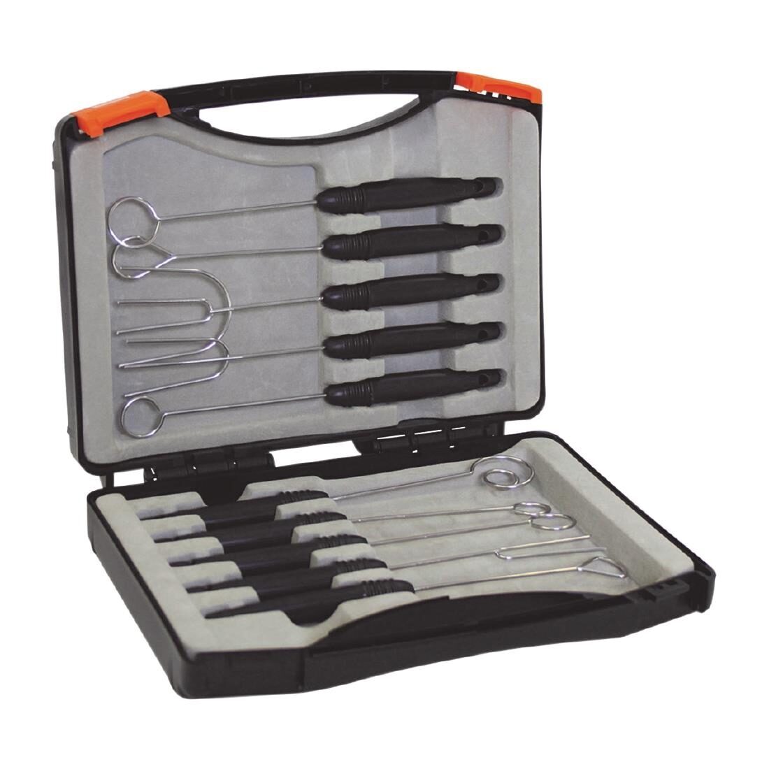 RVS doorhaalvorkjes in duurzaam ABS koffer. Bevat: ronde 14mm, 16mm, 18mm, 20mm, driehoekige, spiraalvormige, druppelvormige vork, 2-, 3- en 4-tands vorkjes.