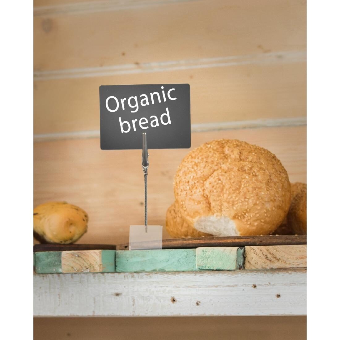 Mini krijtbordlabels voor het labelen van etenswaren bij presentatie, tafels of prijzen. Geleverd met 4 prikkers, 2 houders en een vloeibare krijtstift.