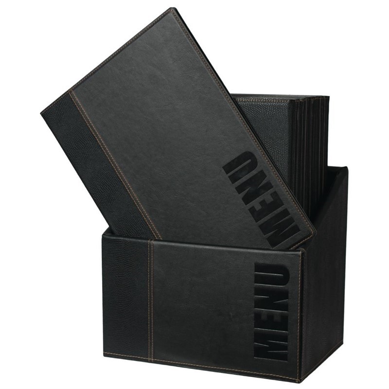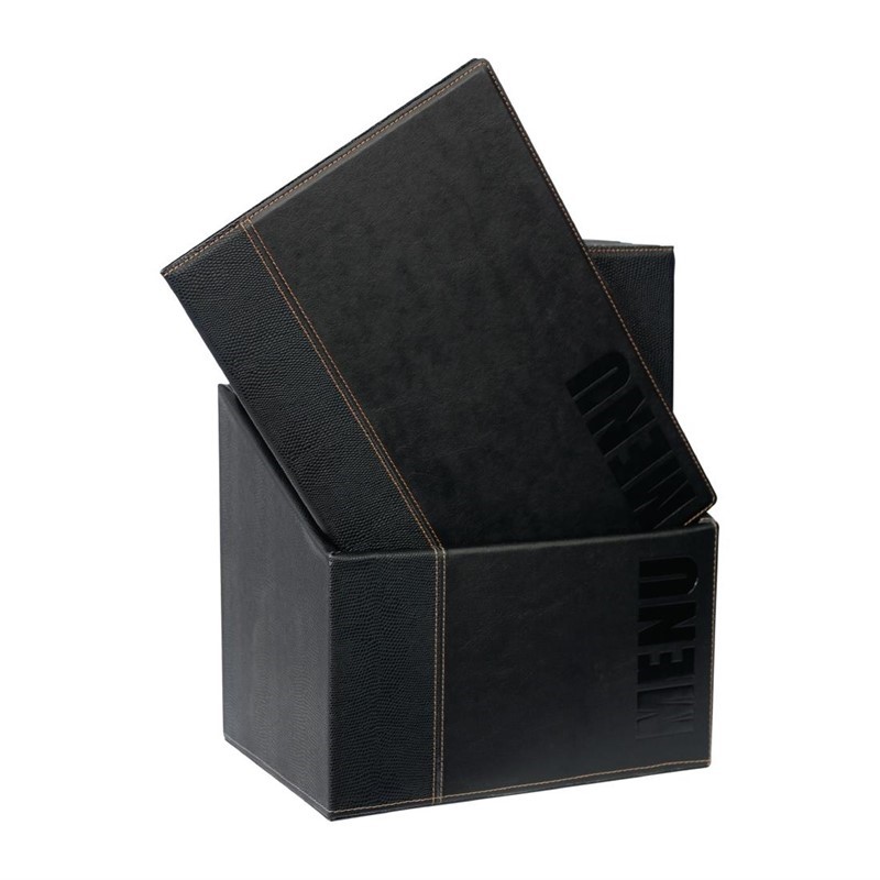 Formaat: A4. Inhoud: 20 kunstlederen menumappen en opbergdoos.