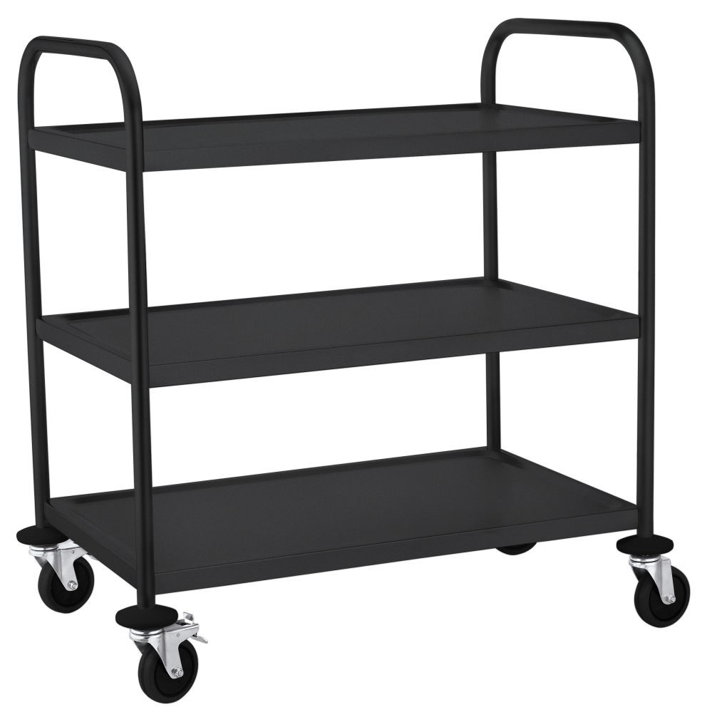 Vervaardigd uit hoogwaardig roestvaststaal met een matte zwarte coating, biedt deze trolley een lange levensduur en een moderne uitstraling. De bladen zijn aan de onderzijde voorzien van geluiddempend materiaal, wat essentieel is voor een rustige ambiance in uw zaak. De robuuste constructie is bestand tegen intensief dagelijks gebruik in veeleisende keukens.