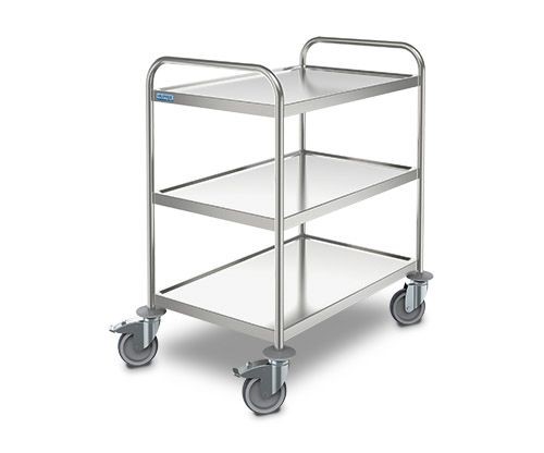 Serveerwagens geheel uit hoogwaardig roestvrijstaal 18/10. Robuuste constructie uit twee gebogen buizen Ø 25 mm, waartussen bladen met een waterkeringsprofiel zijn gelast. Diepgetrokken bladen met een grote hoekradius, waardoor het schoonmaken wordt vereenvoudigd. Deze zijn 35 mm naar beneden omgeslagen, uitgevoerd met “hygiënevouw” en geluiddempend onderlijmd. Voorzien van vier stootrollen van een elastische kunststof, die eventueel gemakkelijk kunnen worden vervangen na demontage van de wielen.