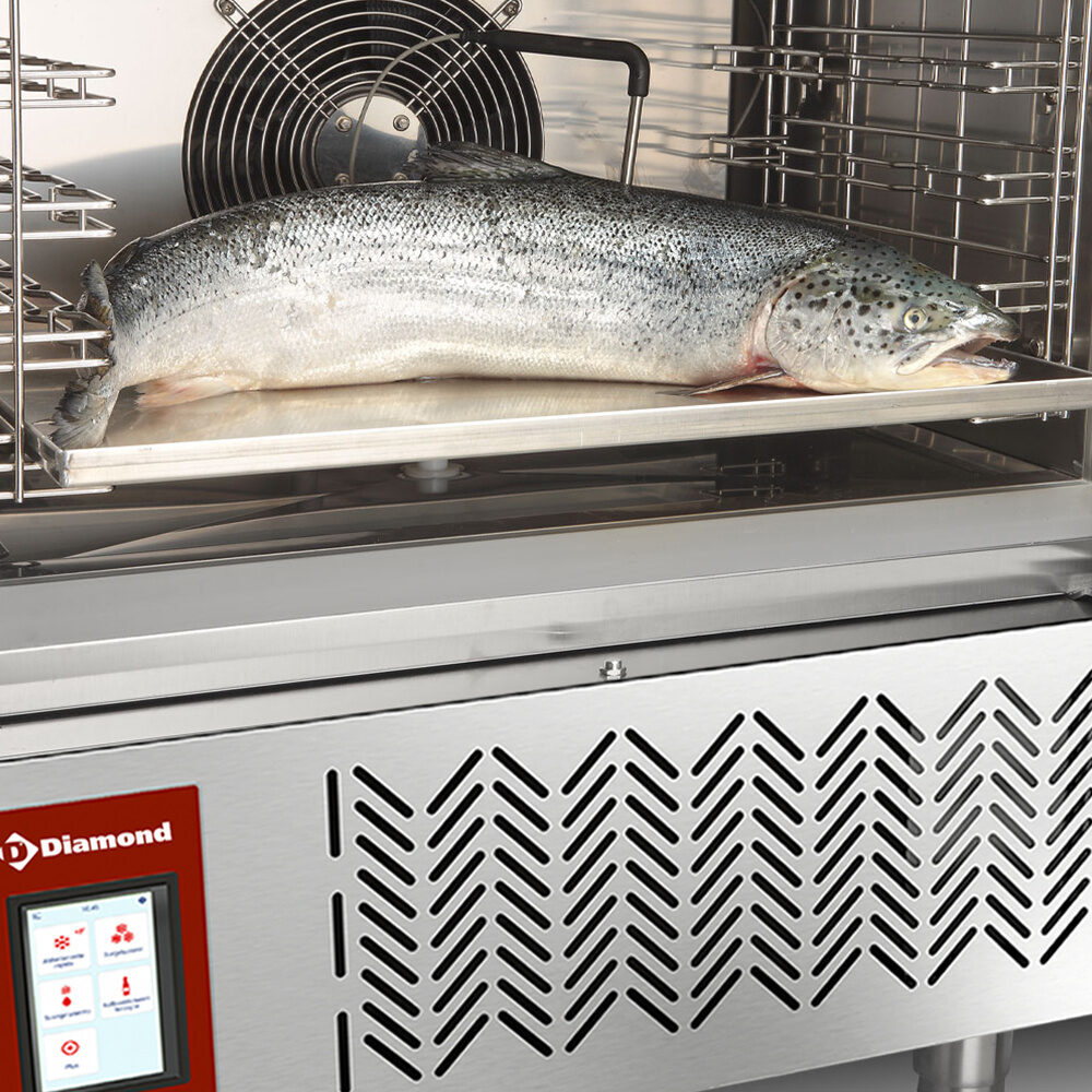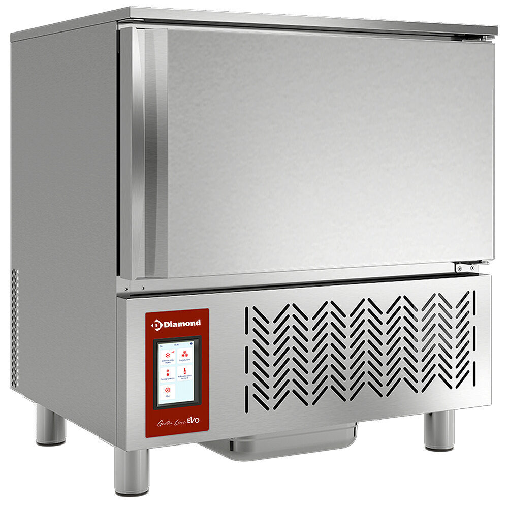- Voedselveiligheid in de koudeketen is gebaseerd op één basisprincipe: C.A.D. de overgang van de kerntemperatuur van +70°C naar +3°C in 90 minuten (VK-norm) of +65°C naar +10°C in 110 minuten (NF-norm) en van +70°C naar -18°C in 240 minuten (VK-norm) of van +65°C naar -18°C in 270 minuten (NF-norm), Diamond cellen garanderen dat u deze verplichtingen nakomt. Het unieke ontwerp van de behuizing, gekoppeld aan de ventilator(en), zorgt voor temperatuurhomogeniteit en voorkomt uitdroging en vorstvorming op het voedseloppervlak.