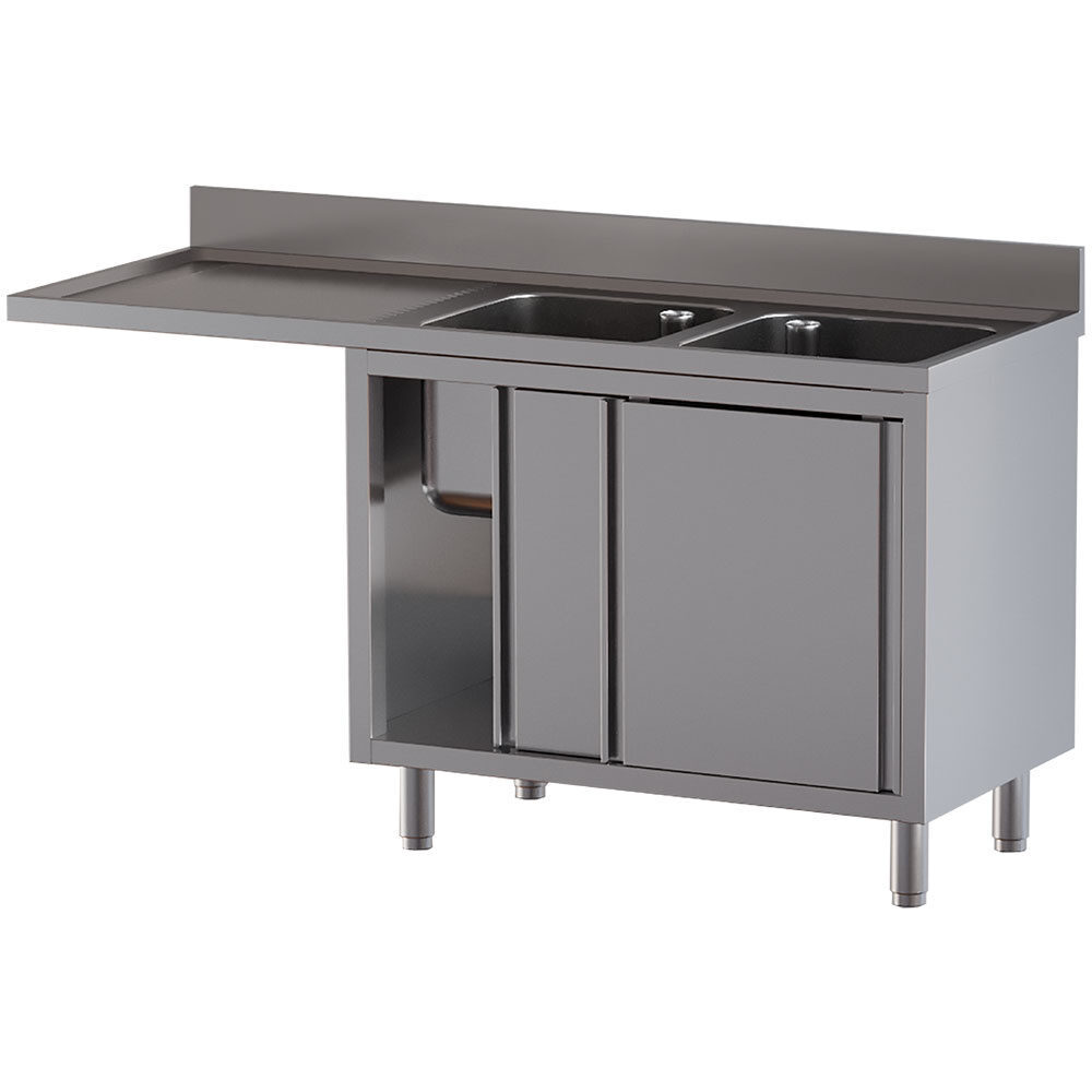 Spoeltafel met 2 kuipen 400×500×300, afdruipblad links, op kast met 2 schuifdeuren en ruimte voor vaatwasser | Diamond | L1621/VAD-SS4