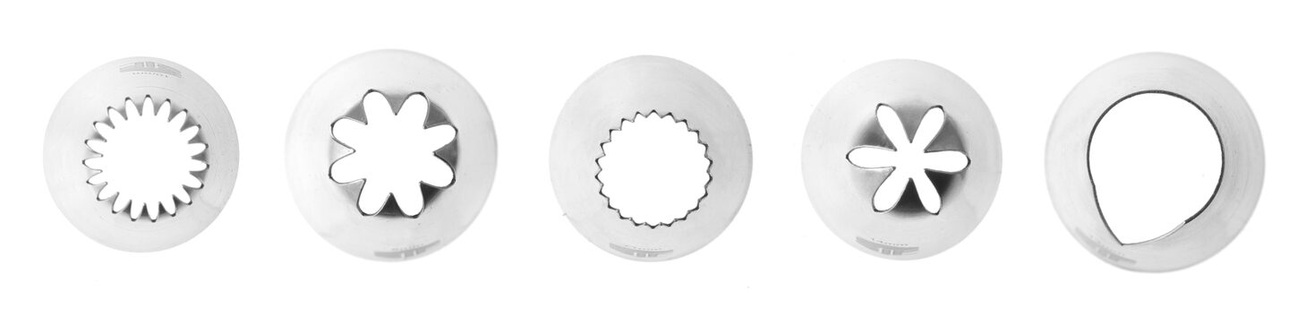 Set bestaat uit 5 spuitmondjes voor decoratie:- 2x closed Star. - 1x drop Flower. - 1x french Star. - 1x v-shaped. Extra nauwkeurig dankzij scherpe randen. Roestvast staal 18/8.