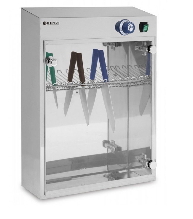 Perfect voor het steriliseren van messen, capaciteit 14 messen. Gemaakt van roestvast staal met plexiglas deur. Inclusief van roestvast stalen messen houder. Steriliseert door middel van bacteriedodend ultraviolet licht. Voorzien van micro-schakelaar om inschakeling met geopende deur te voorkomen. Ingebouwde timer instelbaar tot 60 minuten. Nieuw. PMMA (Plexiglas). Roestvast staal.
