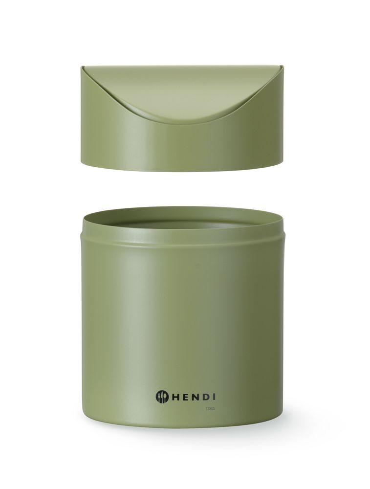 Houd uw tafels en werkbladen moeiteloos schoon en georganiseerd met de stijlvolle Hendi tafelprullenbak. Deze compacte groene afvalemmer van 1,2 liter is de perfecte oplossing voor het discreet verzamelen van klein afval zoals suikerzakjes of theezakjes. Dankzij het praktische schommeldeksel en het duurzame ontwerp is dit een onmisbaar accessoire voor elke professionele horecagelegenheid.