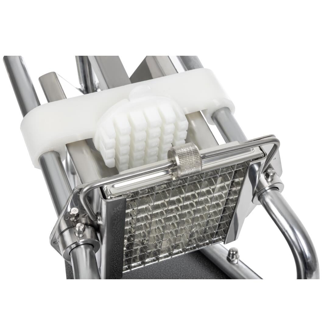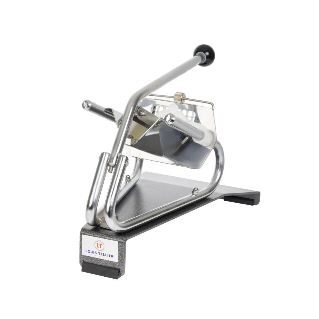 De enige echte authentieke fritessnijder. Voorzien van een zware gietijzeren voet. Wordt geleverd met 10mm mes en duwblok. 34(h)x25(b)x43,5(d)cm. 63,5(d)cm met handgreep volledig uitgeschoven.