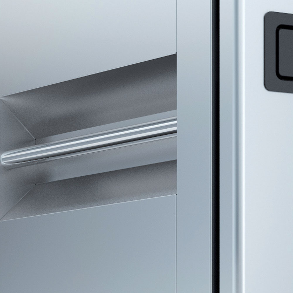 - Scharnierende deur met 270° opening, voorzien van sleutelslot, met een pakking in het deurframe, eenvoudig te vervangen zonder gereedschap.