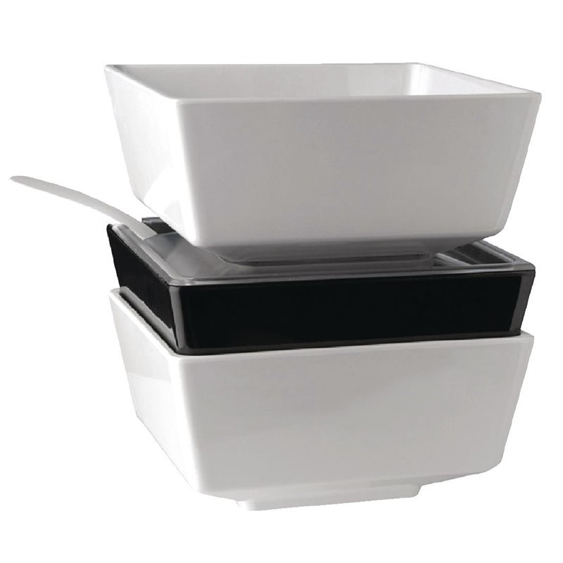 De APS vierkante melamine kom in elegant zwart 1,5L heeft een discrete voet waardoor deze lijkt te zweven op tafel. De kom combineert een strakke rand met een glad oppervlak wat hem duurzaam, tijdloos en klassiek maakt.