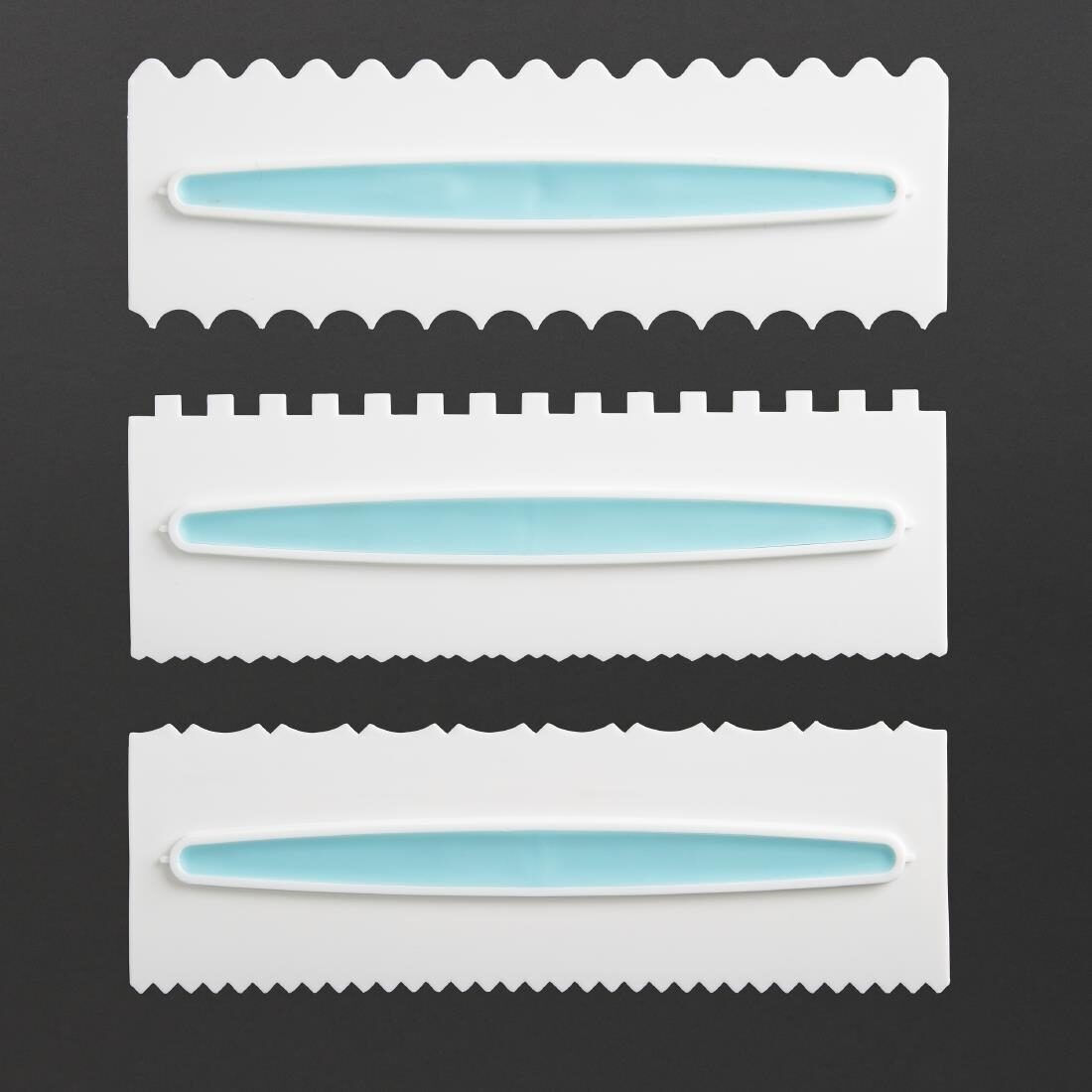 Decoreer je taarten tot in de perfectie met Vogue icing kammen. Verkocht in sets van 3, de kammen bieden een verschillende ontwerp aan elke kant, zodat je zes verschillende effecten krijgt voor je icing. Of het nu een delicate golvende patroon is, of ingewikkelde krullen en wervelingen, de Vogue icing kammen maken taartdecoratie net iets makkelijker.Elke kam is lichtgewicht en makkelijk te gebruiken, dus zelfs als je grotere hoeveelheden taarten decoreert, verminderen de kammen de belasting op de arm. Bovendien zorgt de ingebouwde handgreep ervoor dat je de kammen stevig kunt vasthouden, waardoor de kans op fouten kleiner wordt.