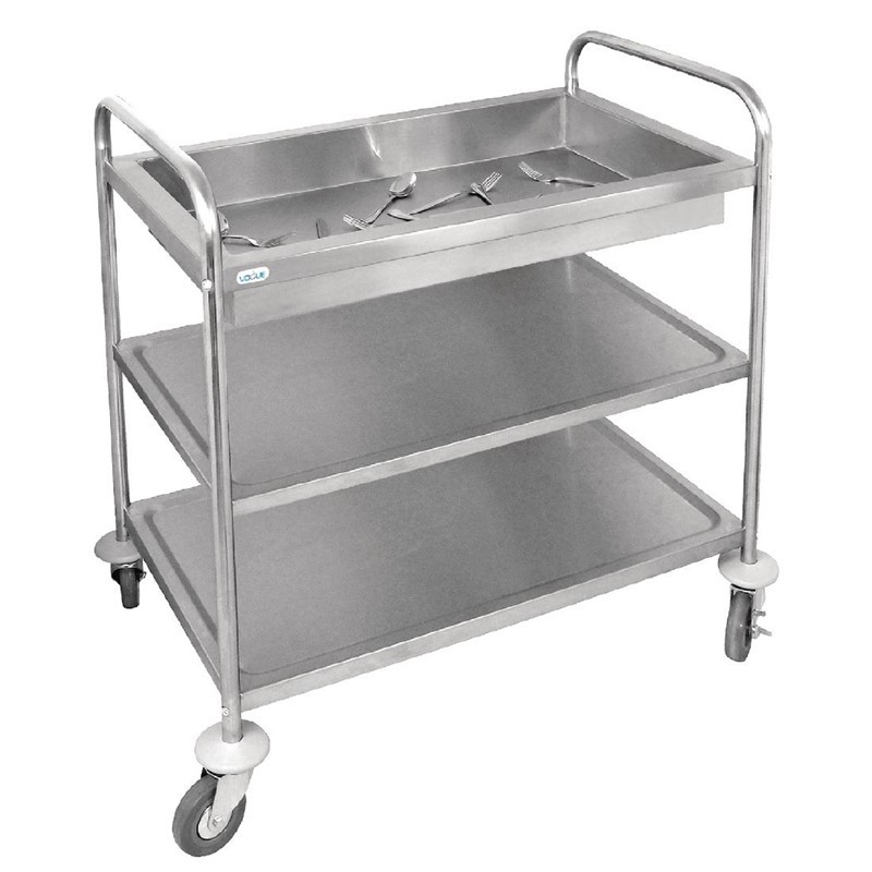 RVS serveerwagen voorzien van diepe bestekbak, voor het verzamelen en transporteren van bestek en andere kleine items, en twee standaard bladen.