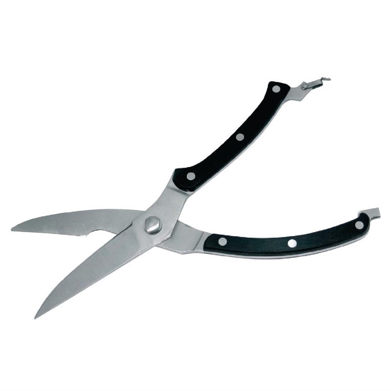 De hoge kwaliteit RVS wildschaar is het perfecte gerei om door botten en gewrichten heen te snijden. De handgreep is voorzien van een klem zodat de schaar geen gevaar vormt waneer u hem niet gebruikt. Dankzij de scherpe lemmeten glijdt de schaar moeiteloos door het vlees.