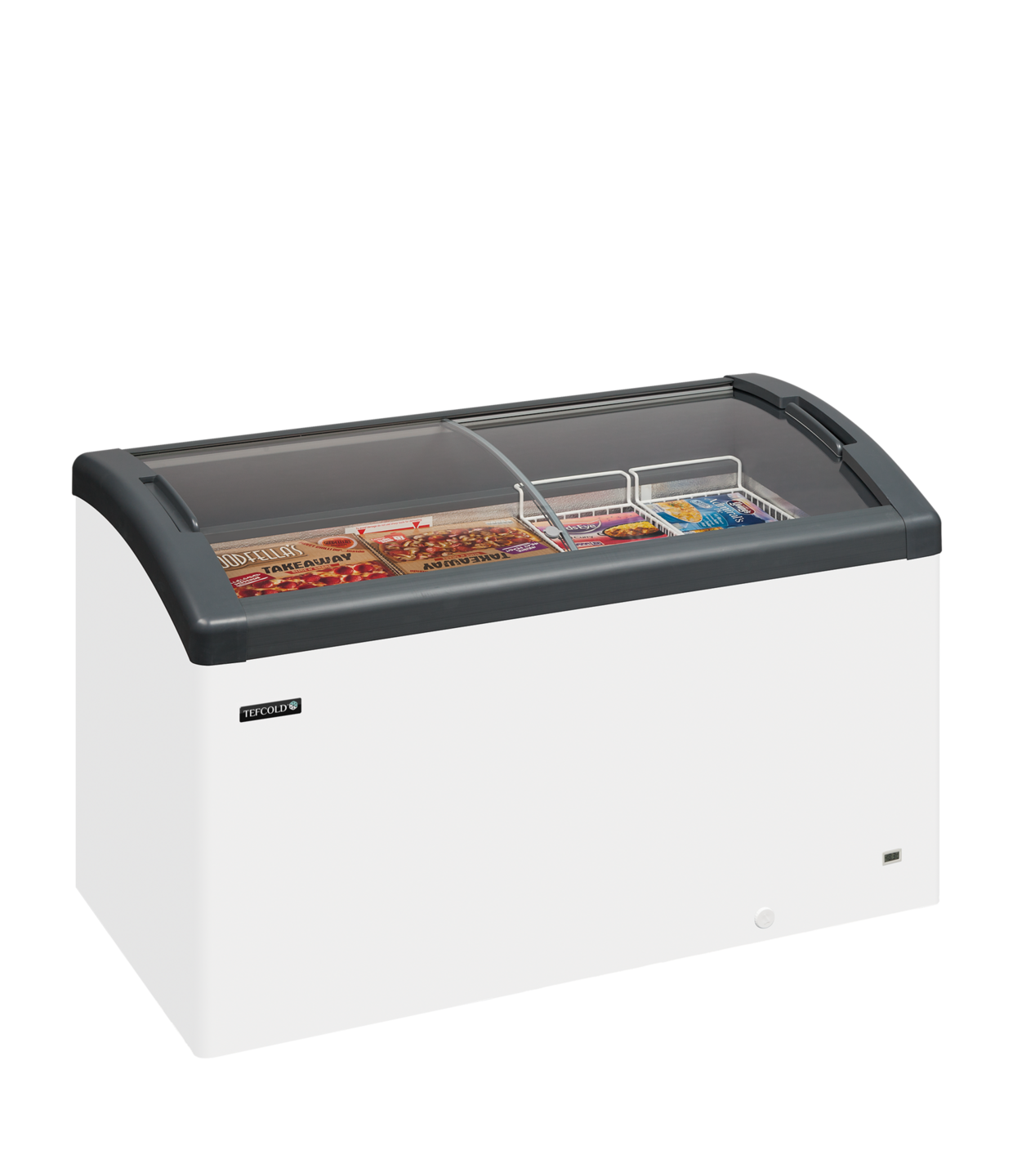 Diepvrieskist met gebogen glazen schuifdeksels.