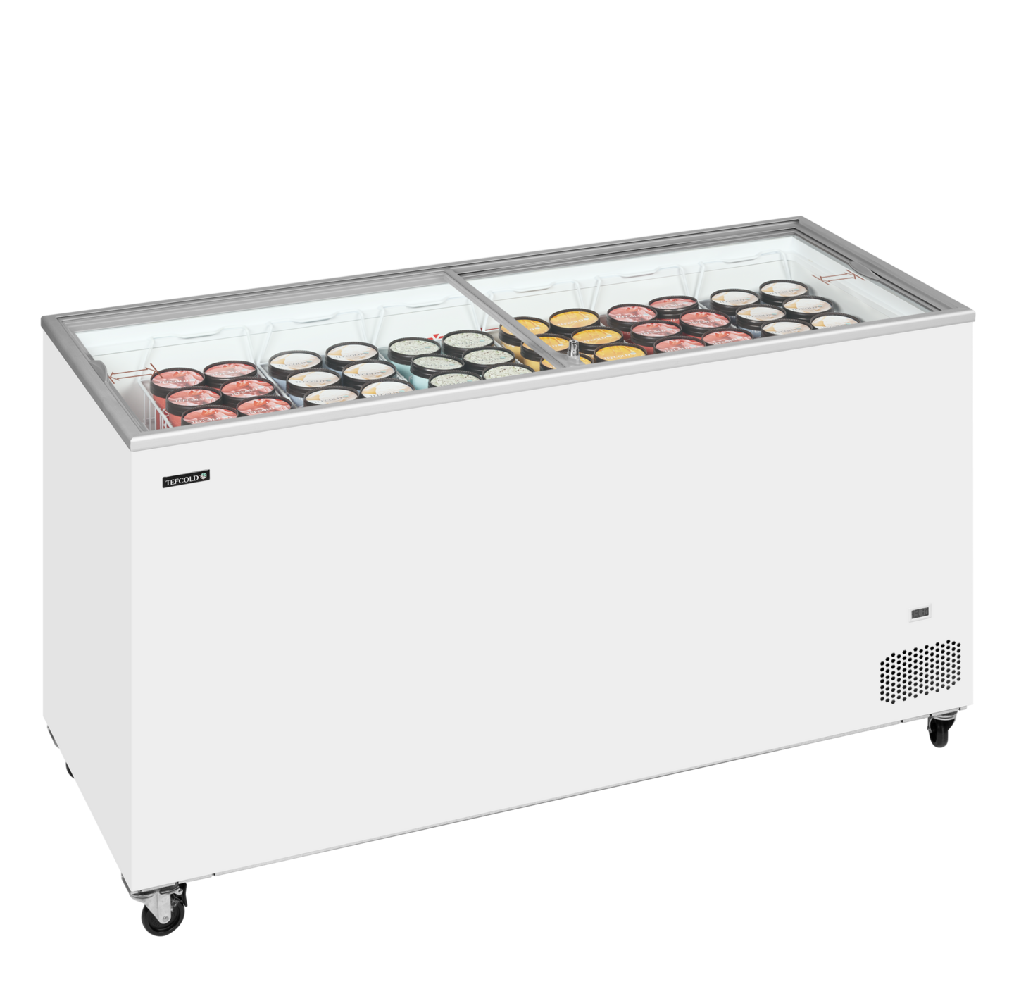 Diepvrieskist met vlakke glazen schuifdeksels.