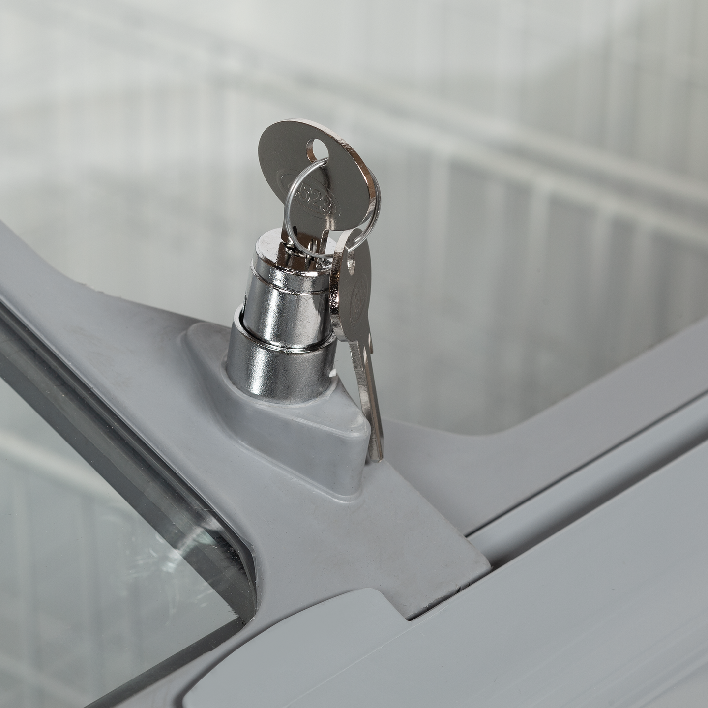 Elegante diepvrieskist met gebogen glazen schuifdeksels.
