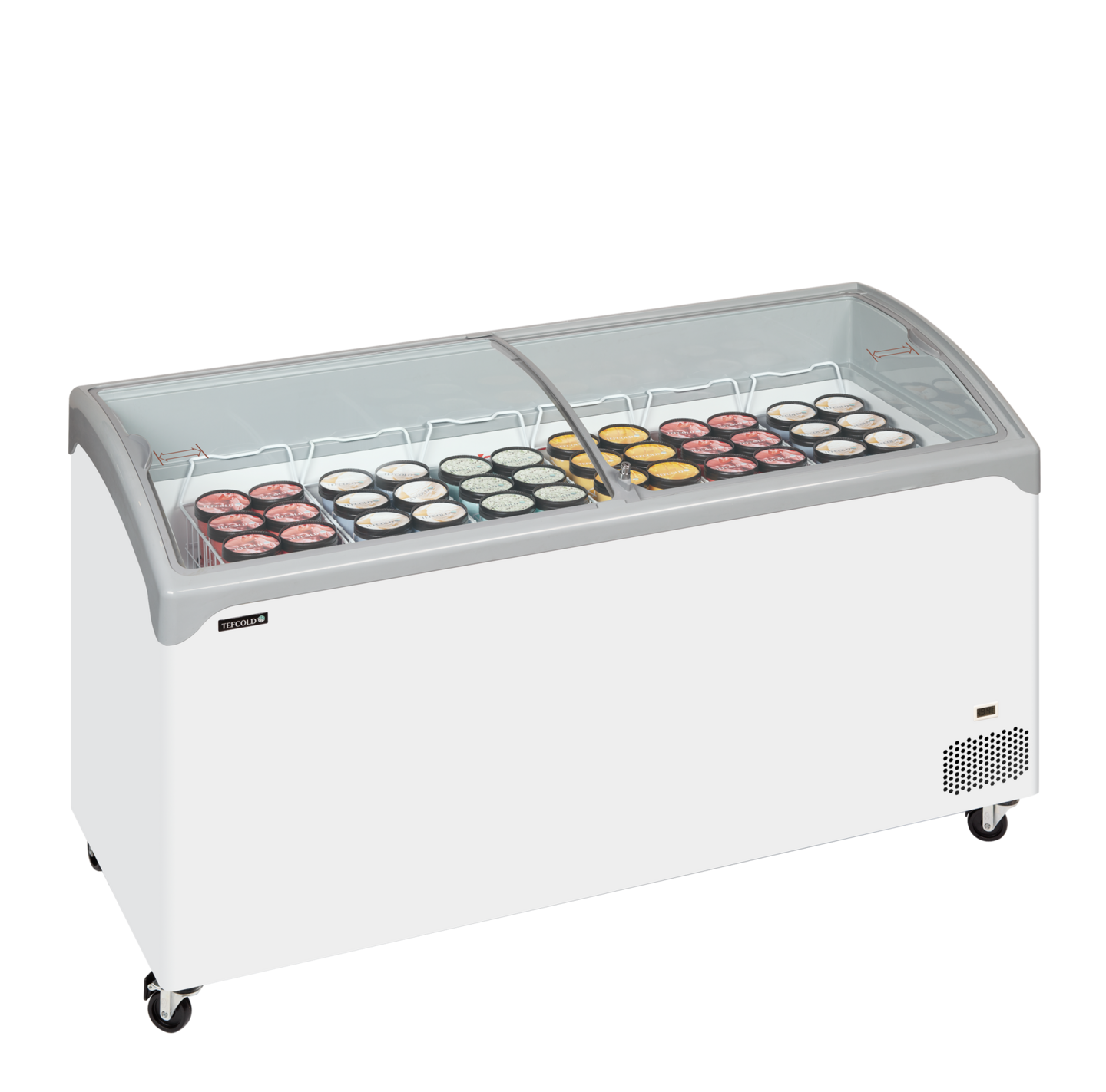 Elegante diepvrieskist met gebogen glazen schuifdeksels.